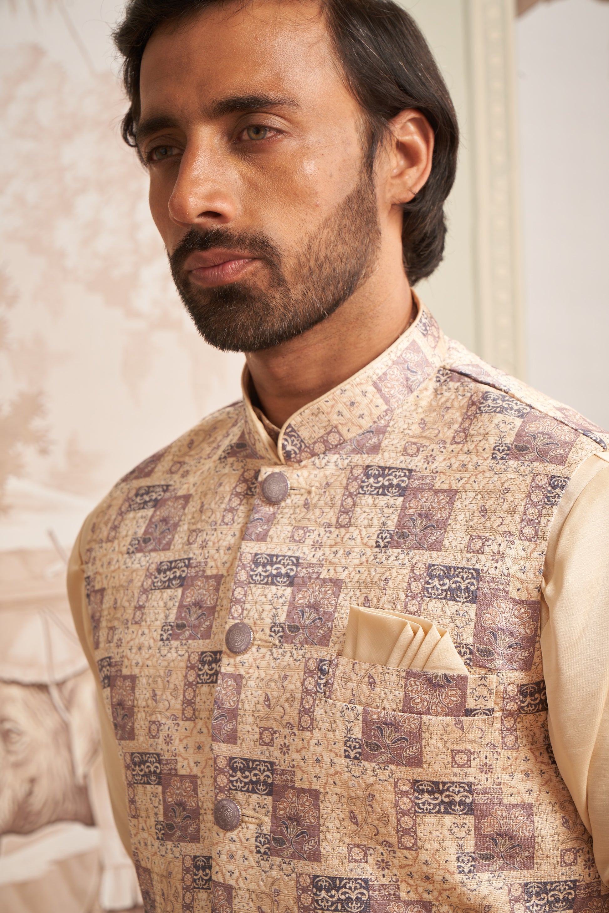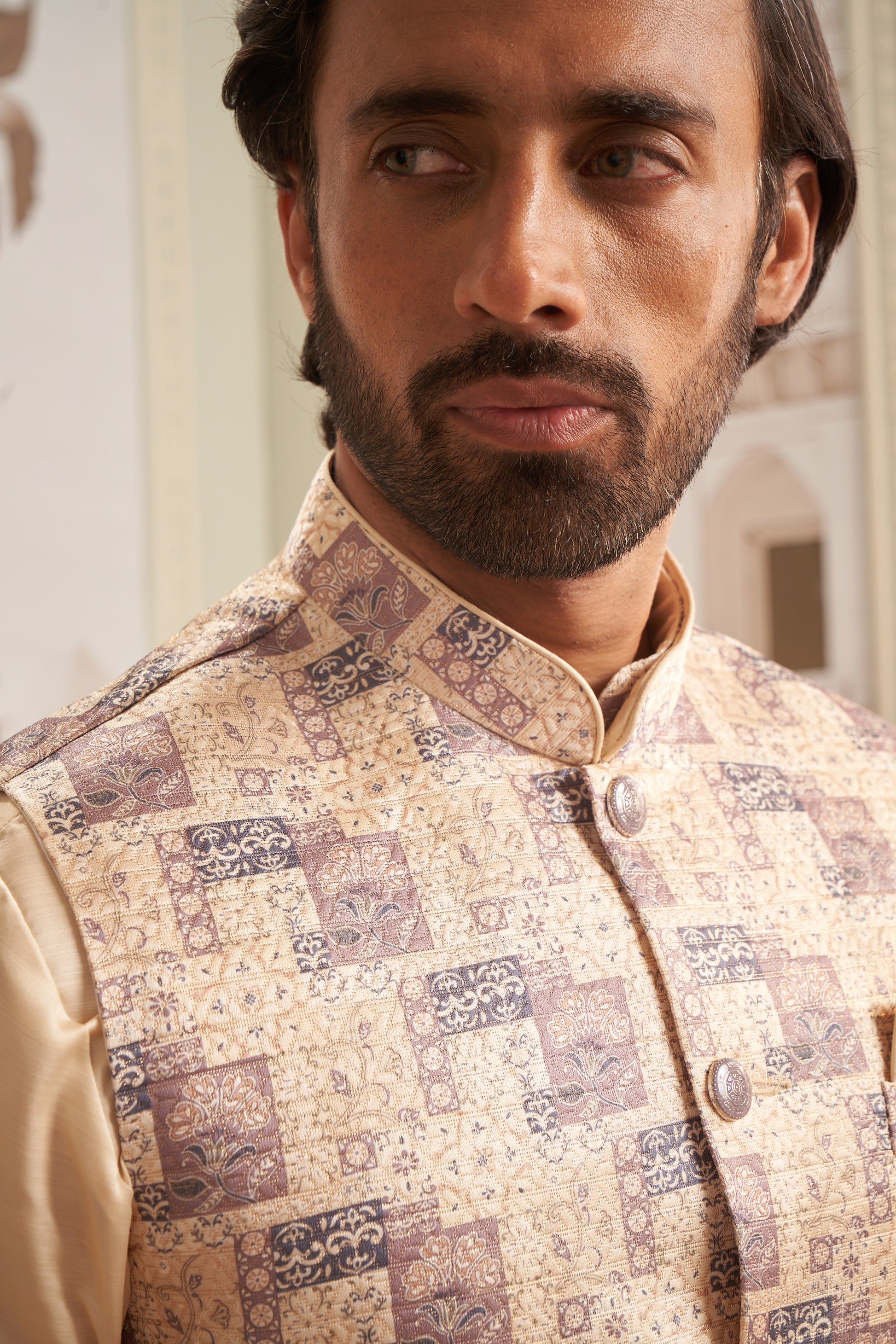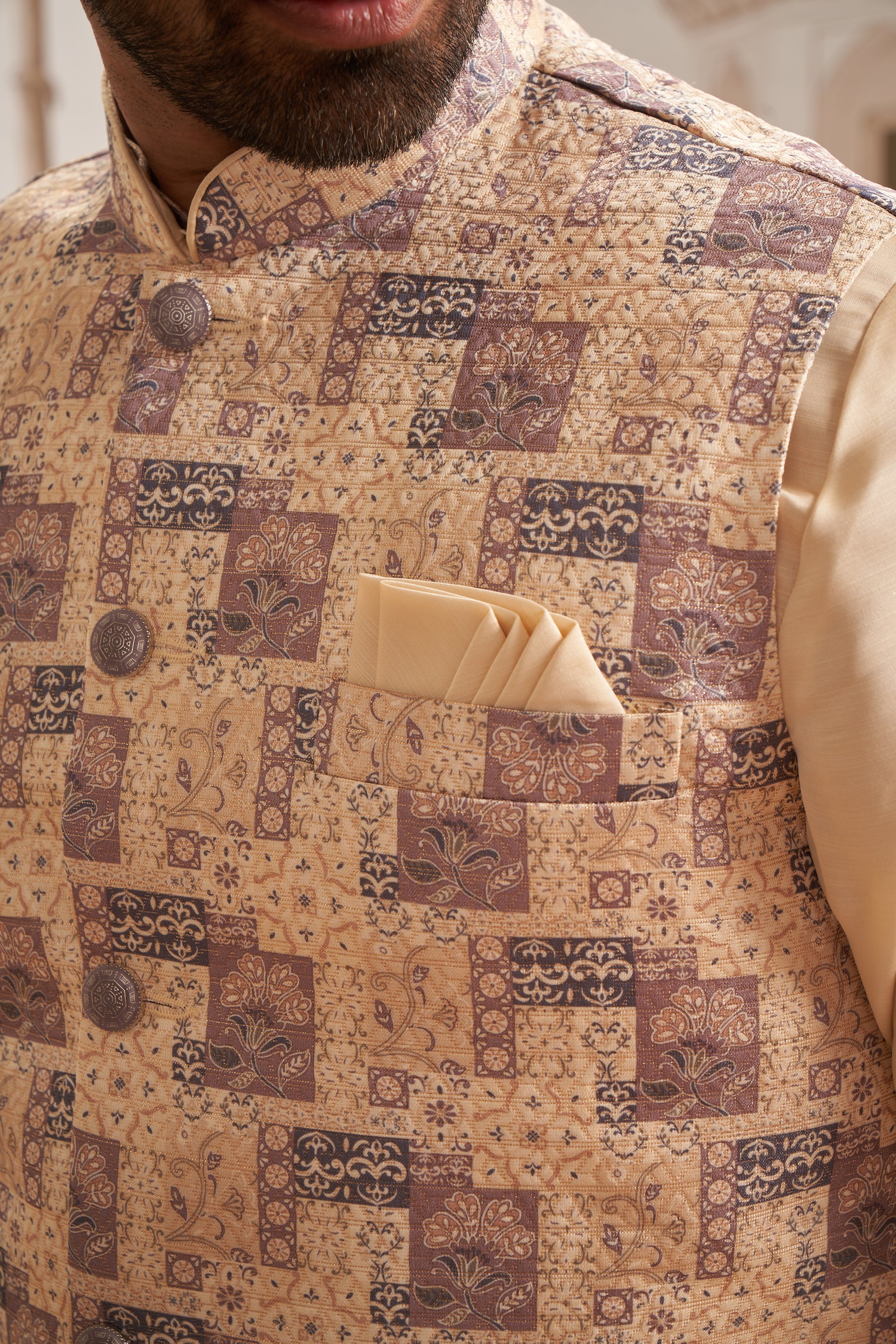 Classic Bundi Jacket – A structured Nehru-style waistcoat, featuring intricate embroidery, textured weaves, and premium embellishments for a refined, royal look.